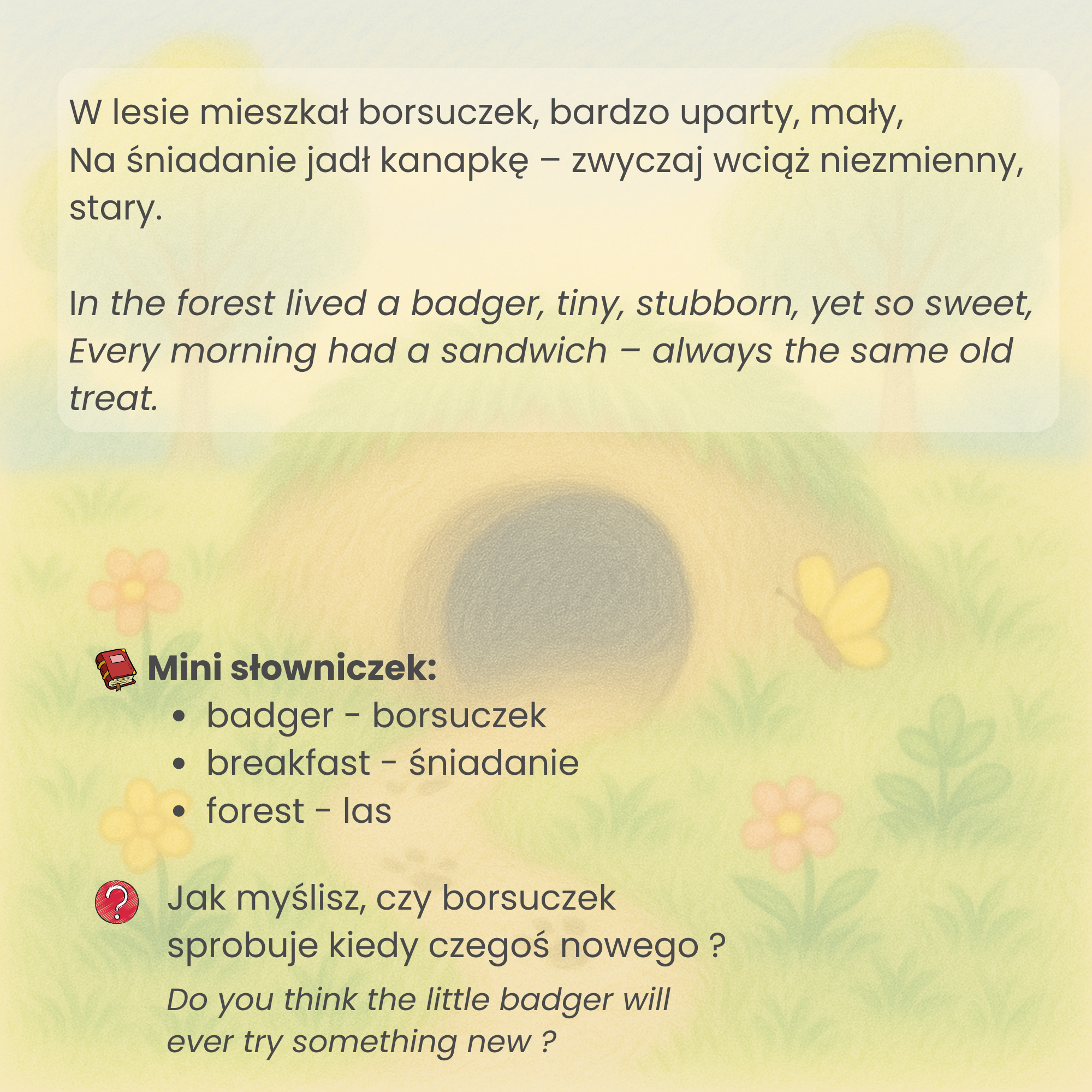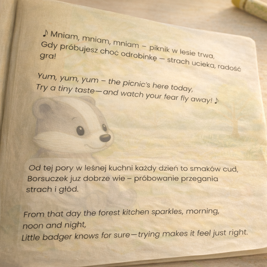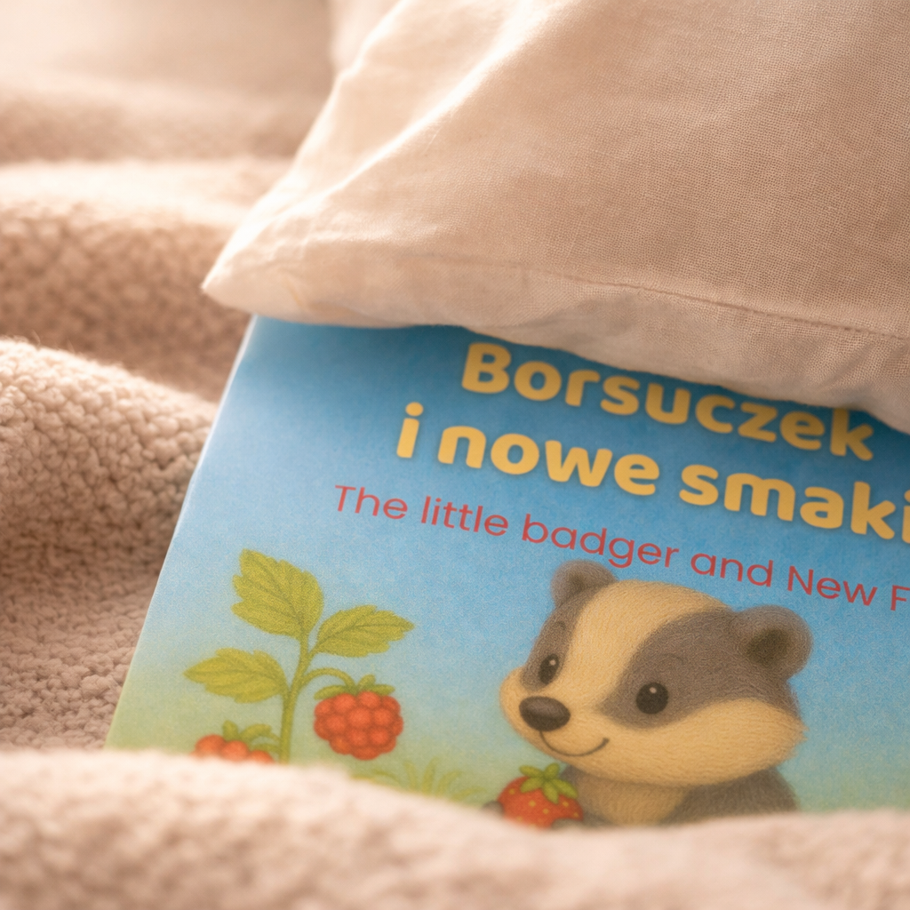 Ciepła, dwujęzyczna opowieść (PL/EN) o małym borsuczki, który uczy się próbowac nowych rzeczy. Rymy i powtarzalny refren pomagają wracać do historii, a pytania „Pomyśl” zapraszają do wspólnego czytania i rozmowy — bez presji, we własnym tempie.