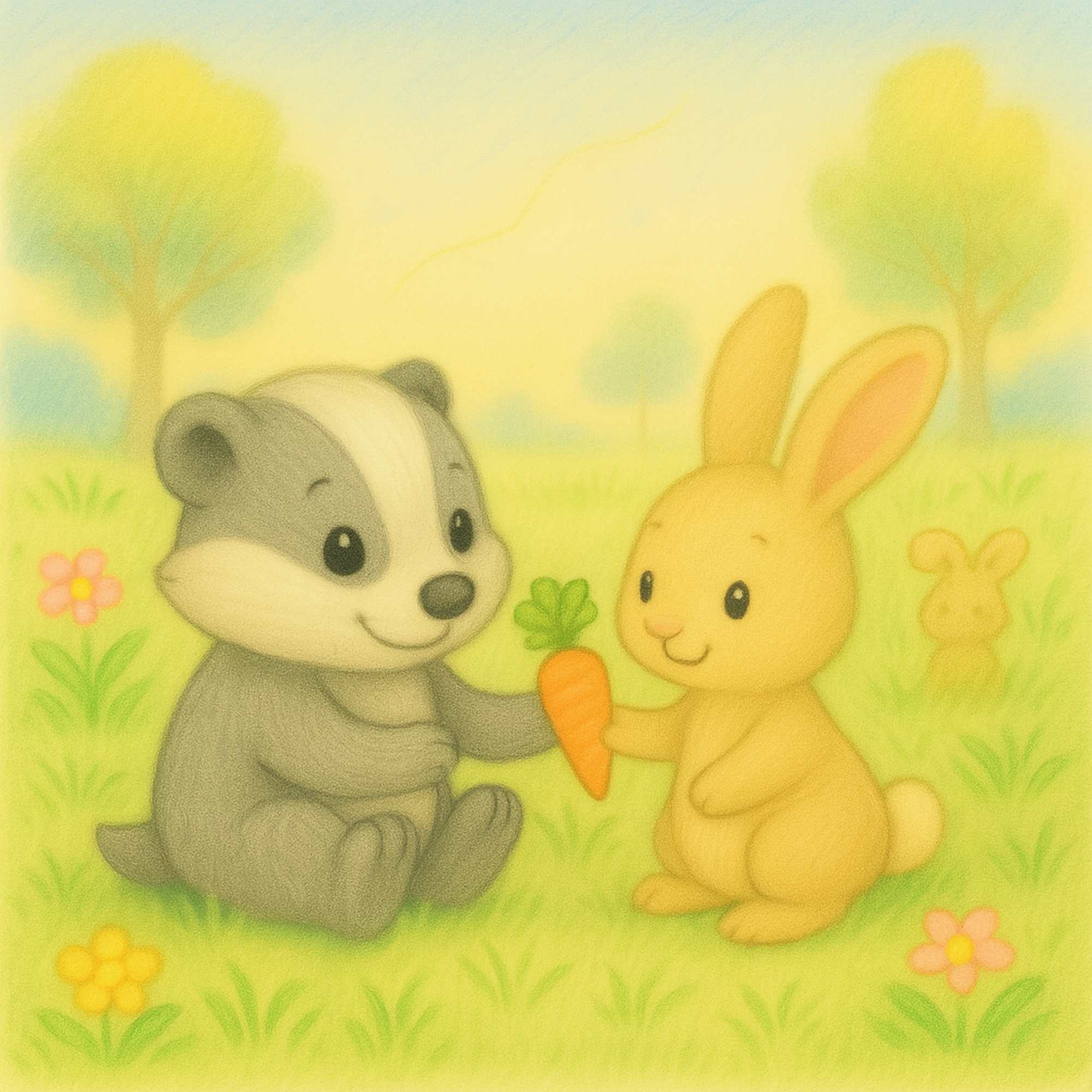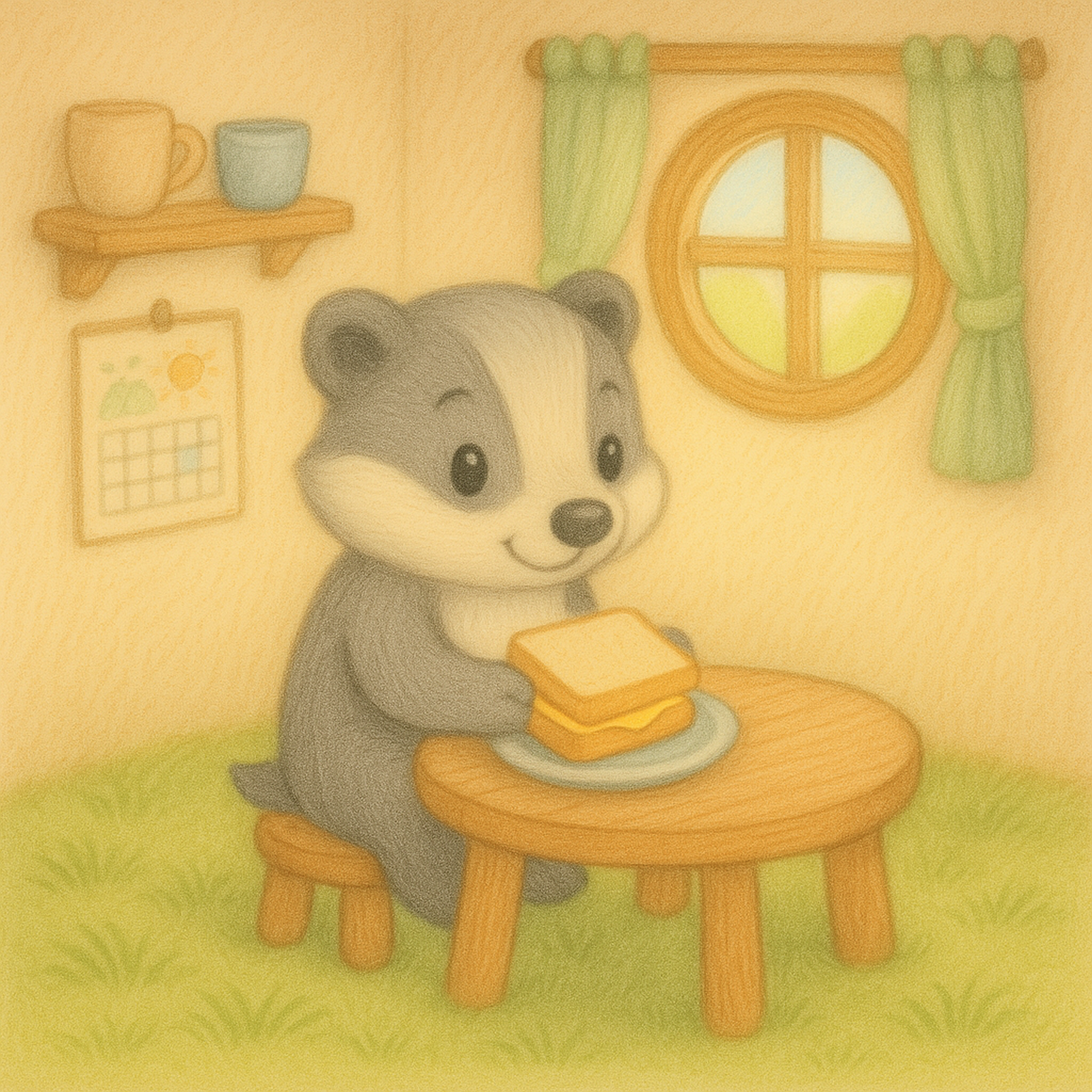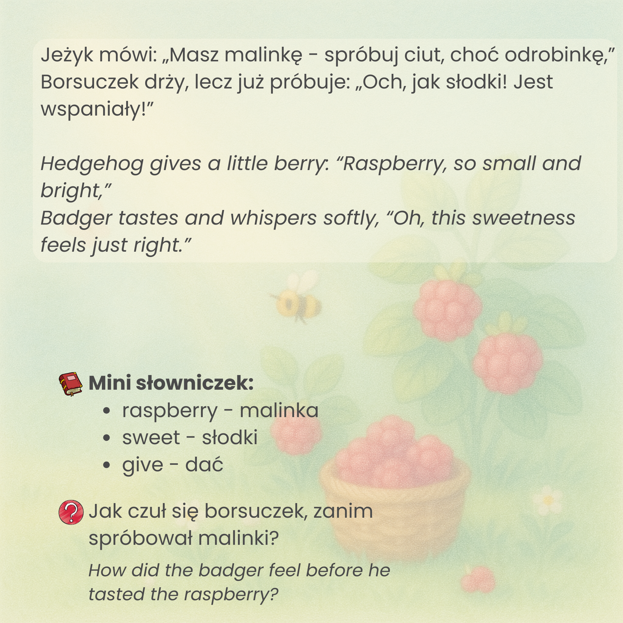 Ciepła, dwujęzyczna opowieść (PL/EN) o małym borsuczki, który uczy się próbowac nowych rzeczy. Rymy i powtarzalny refren pomagają wracać do historii, a pytania „Pomyśl” zapraszają do wspólnego czytania i rozmowy — bez presji, we własnym tempie.